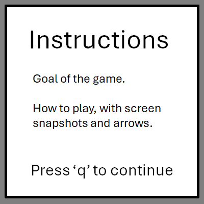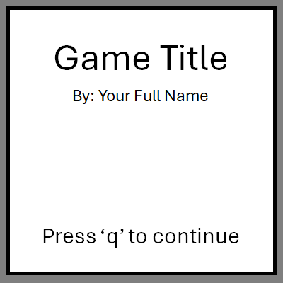 | June 1 Due: Win - Work on Animation Project, begin on screens - Designing the Splash and Instructions - Making the splash, instructions (video) - Pics: Welcome, Rules, GameOver, Win - PDF Screens Code, TXT Screens Code |