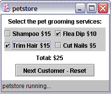 JCheckBox shampoo, fleaDip, trim, cutNails;