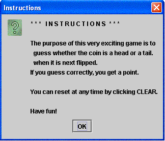 JOptionPane.showMessageDialog (null, "* * * I N S T R U C T I O N S * * * \n \n" + "The purpose of this very exciting game is to \n" + " guess whether the coin is a head or a tail. \n" + " when it is next flipped. \n" + "If you guess correctly, you get a point. \n \n" + "You can reset at any time by clicking CLEAR.\n \n" + "Have fun!", "Instructions", JOptionPane.QUESTION_MESSAGE);