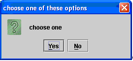 //Show an information panel with the options yes/no and message 'choose one': String input2 = JOptionPane.showConfirmDialog (null, "choose one", "choose one", JOptionPane.YES_NO_OPTION);